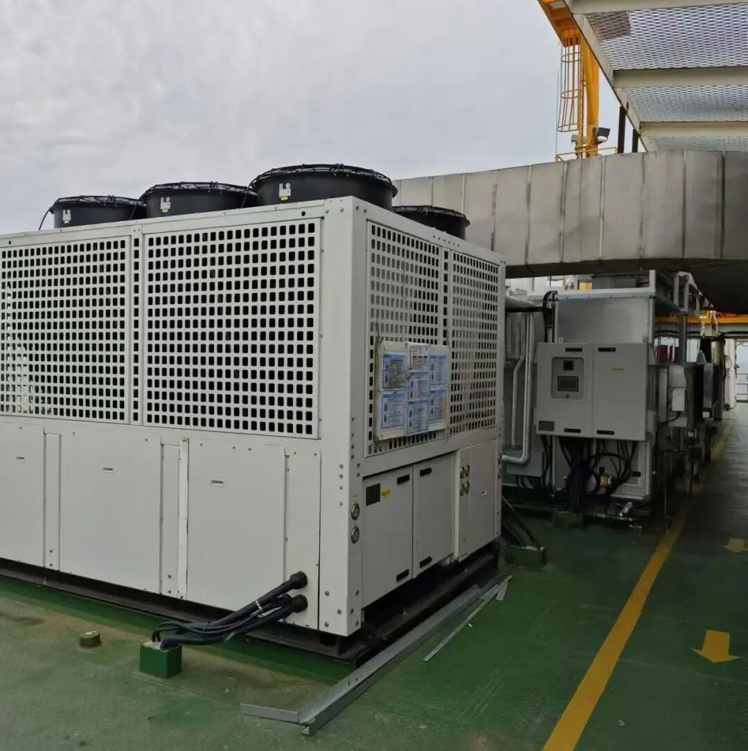 以海上平台生活楼为例,某平台中央空调系统机组使用年限较长,机组各部件出现老化现象,机组性能严重降低,不仅存在不可预知的风险,且每年的维护成本急剧增加,已不符合国家的“双碳”政策要求。尼尔森经过多次实地调研和技术分析,选择超低温空气源直膨机组作为升级方案,替代原有船用直接空调。
